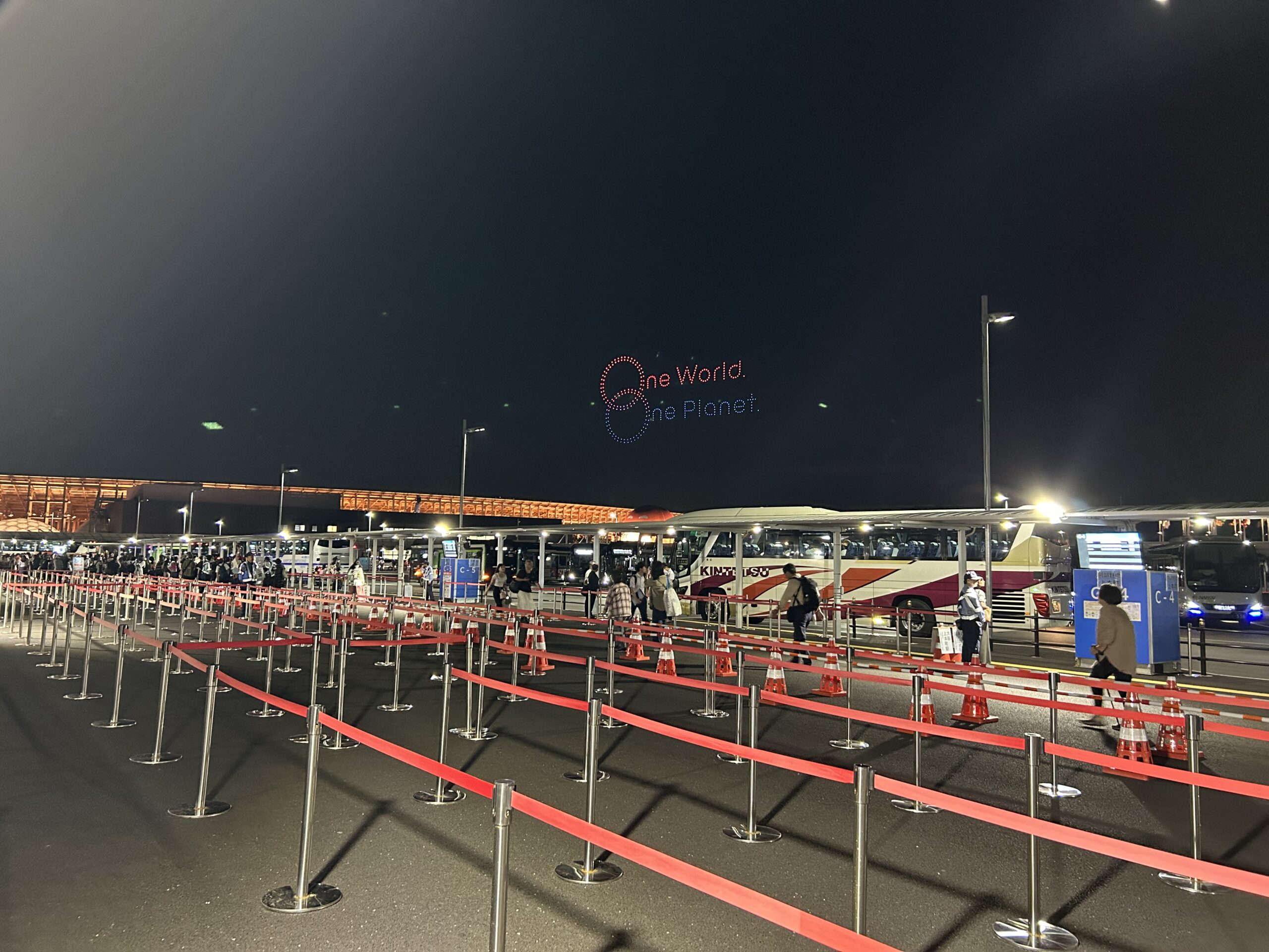 バス停の前にいるときにドローンショーが開始されたので、バスを3台見送ってドローンショーを見ました。
